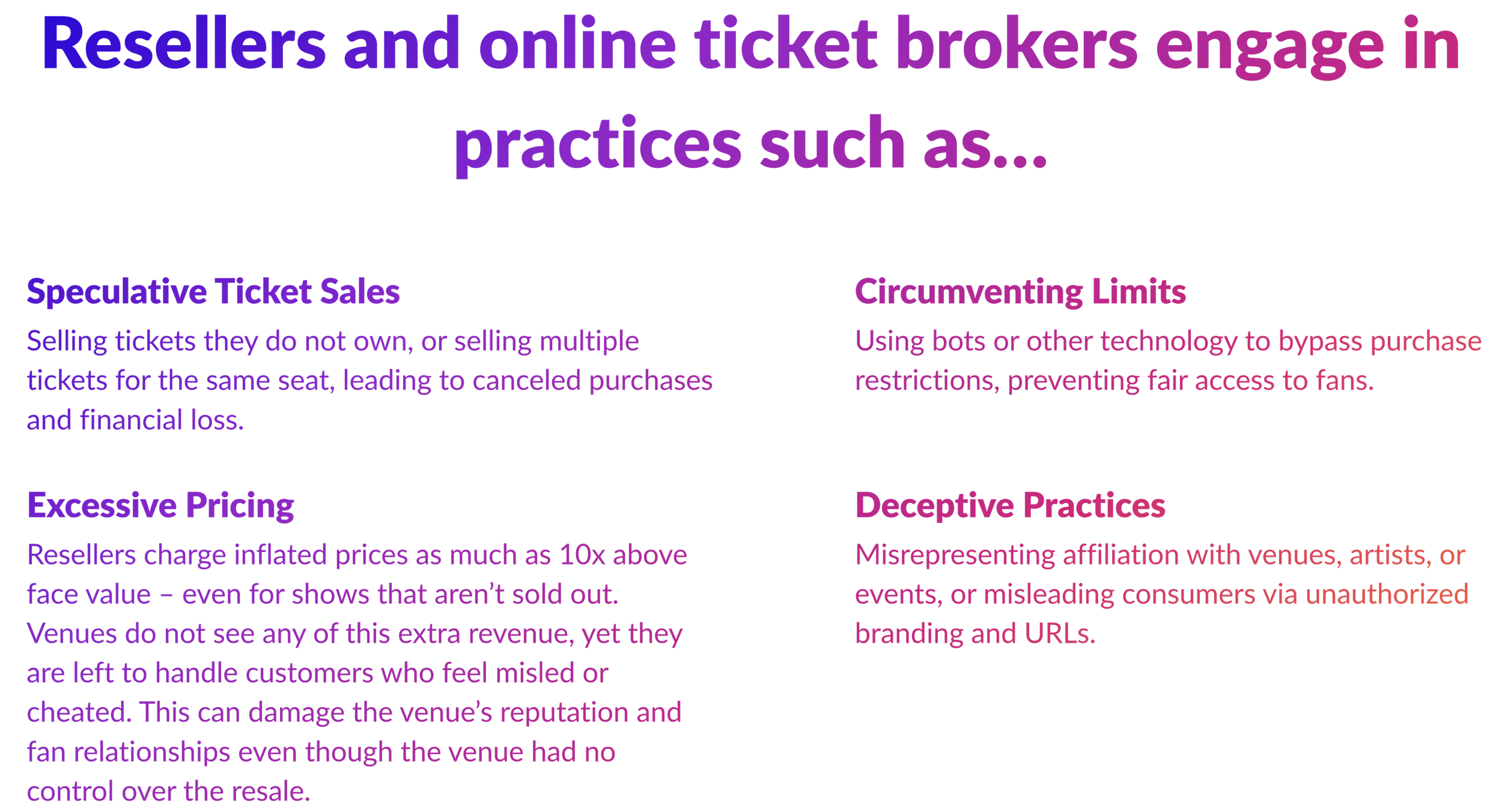Artists and venues can limit transferability, enforce conduct policies, and manage purchase limits.