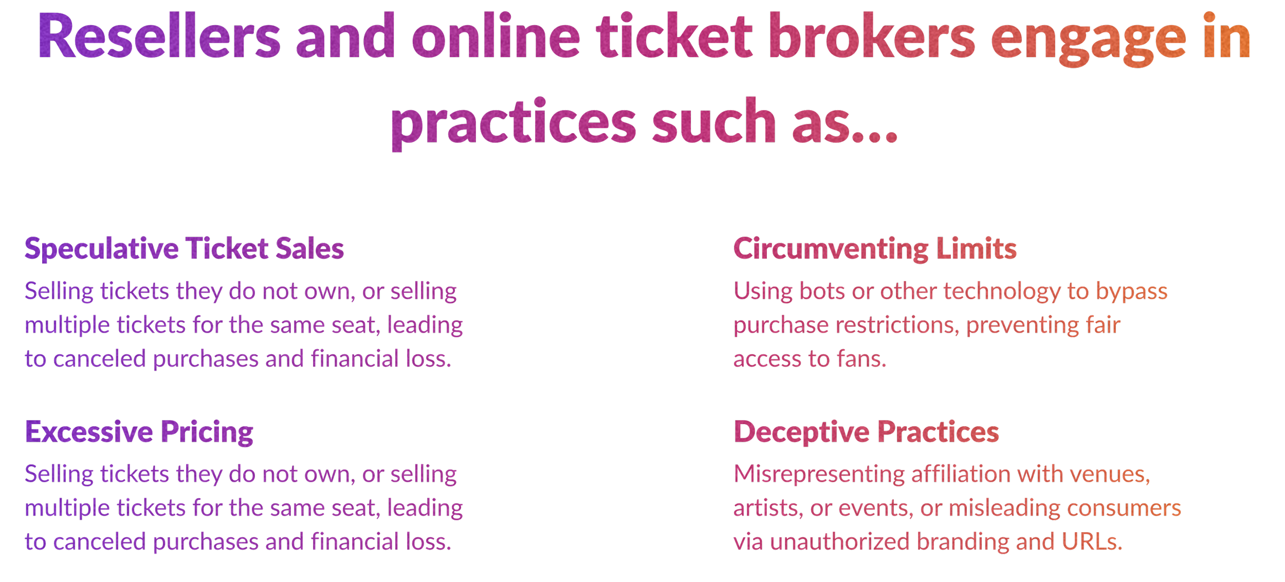 Resellers may only sell tickets they own. Duplicate ticket sales are banned.